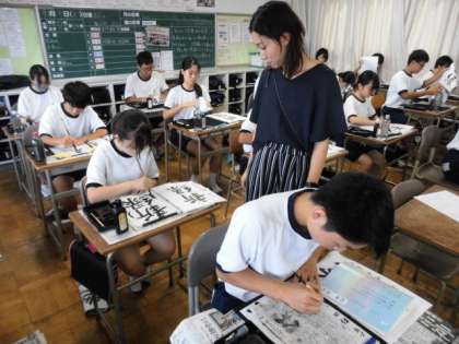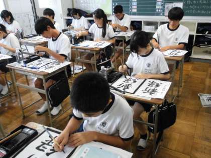 国語の授業で、「新緑」という字を書いています。行書の特徴を理解し、点画の変化、連続、省略や、筆順の変化に注意して練習しました。