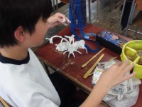 12月6日(水) 6・7組 木材加工 公開日 2023/12/06 更新日 2023/12/06 6・7・8組 技術科の授業で、木材を加工してブックケースを作っています。今日は、部品をのこぎりで切りました。木材を押さえておかないと、動いてしまってうまく切れません。しっかり押さえて、のこぎりをまっすぐ後ろに引くのは、なかなか難しいです。うまく切れたかな?