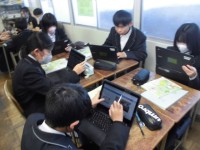 家庭科の授業で「6つの食品群と食品群別摂取量の目安」について学んでいます。今日は、さまざまな食品を栄養素的ない特質に着目して、6つのグループに分けました。6つのグループに分けて食品シールを貼った各自のノートを見せ合いながら話し合いました。