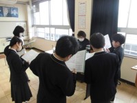 音楽の授業で、歌の練習をしました。予餞会や立志式などで歌う合唱曲を、学年ごとに分...