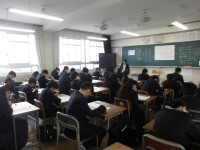 今日はあいにくの天気の中、生徒たちは元気に登校しています。今日は早速学力テストがあり、生徒たちは小学校で習ったことを思い出しながら、時間いっぱいまでがんばっていました。