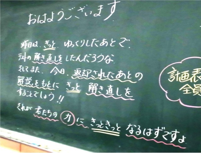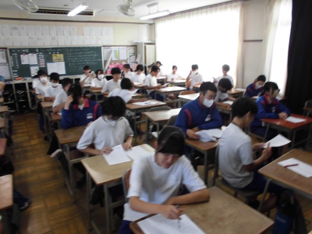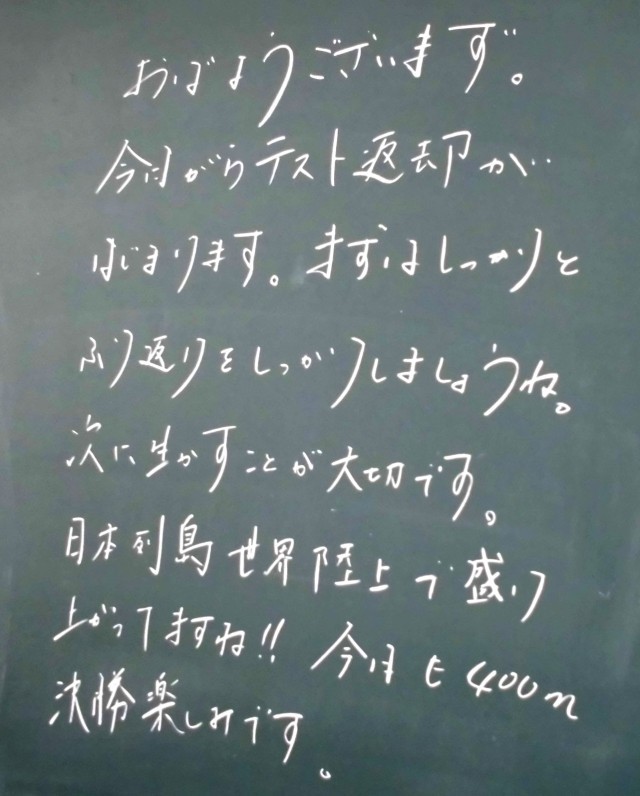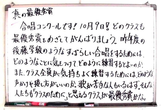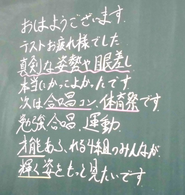 中間テスト、お疲れさまでした。今日から、また、一歩一歩前進していきましょう。いよいよ合唱コンクールの練習が始まります。クラスの全員が気持ちよく参加できるコンクールにしていきましょう。2年生のみなさんなら、やり切ることができるはずです。楽しみにしています。