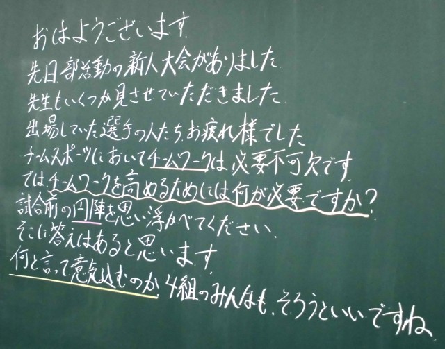 後期に入りました。3年生の先輩からバトンを受け継ぎ、2年生のみなさんが活躍する場面が増えていきます。仲間や相手を思いやり、労わる気持ちをもって行動を続けていってください。みなさんの心が広く、たくましく成長していくことを楽しみにしています。