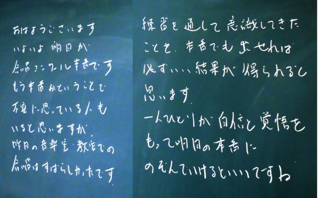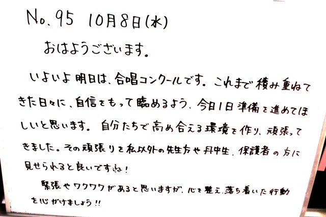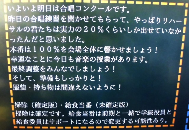 明日の合唱コンクールに向けて、しっかり準備をしてくれた3年生のみなさん、明日の合唱を楽しみにしています。どんな気持ちを込めて合唱をしてくれるかも楽しみです。きっと素敵な1日になりますね。