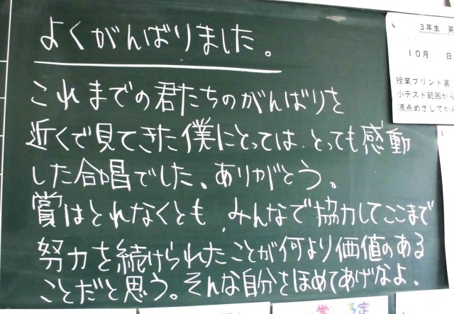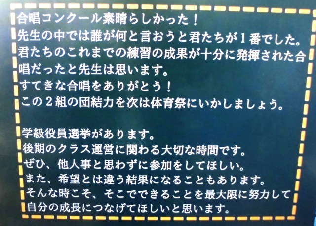 登校後の教室では、昨日の合唱コンクールの余韻が残っていることを強く感じました。子ども達にとって、とても意味深い1日であったようです。素敵な合唱をありがとうございました。次の目標に向かうみなさんの姿を楽しみにしています。