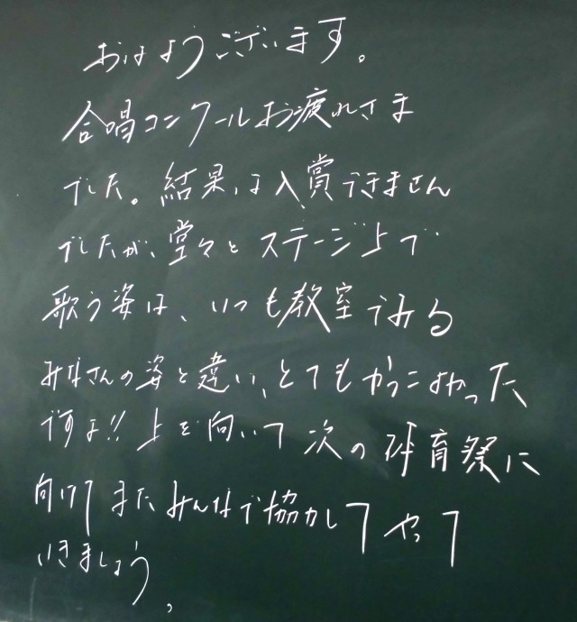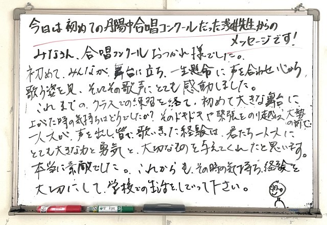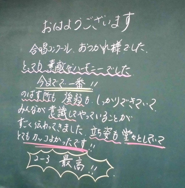 昨日の合唱コンクール、2年生のみなさんの成長を強く強く感じる1日でした。1年間の間にこんなにがんばる力をつけたのですね。素晴らしいです。これからのみなさんのさらなる成長が楽しみでなりません。がんばってください。