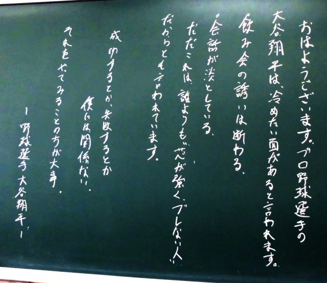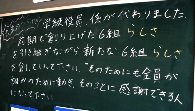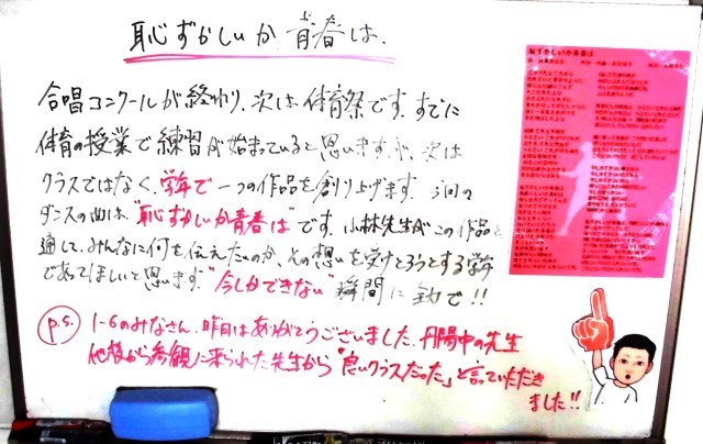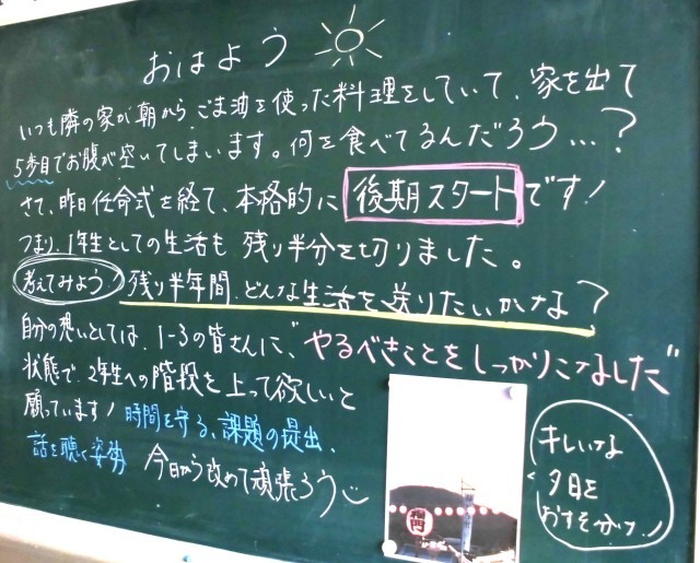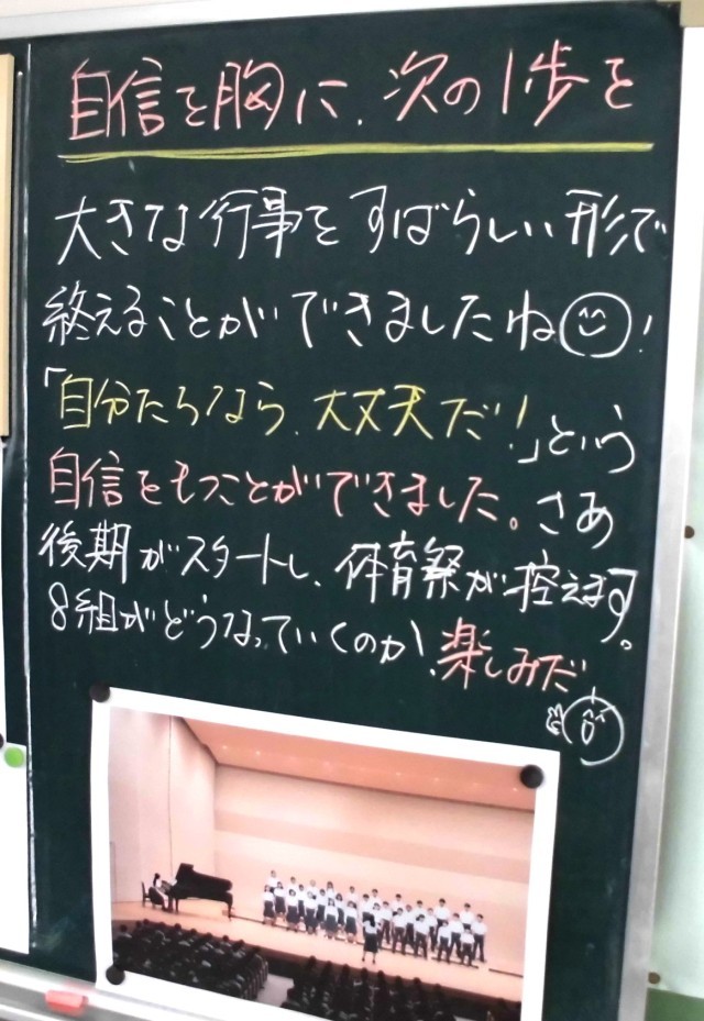 後期がスタートしてから2週間、合唱コンクールが終わって1週間が経ちました。それぞれの場面でがんばる1年生のみなさんの姿はとても素晴らしいと思います。さあ、次は体育祭ですね。初めての体育祭です。全力で取り組んでください。クラスの輪、学年の輪をしっかりと作り上げてくださいね。