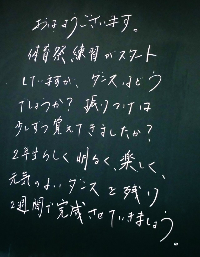 体育祭の練習が始まりました。学年の団結力を高めるために、ダンスの練習を一生懸命にがんばっています。学習にも、一人一人が目標をもって取り組んでいます。2年生のみなさんの活躍する姿をたくさん見ることができてうれしいです。