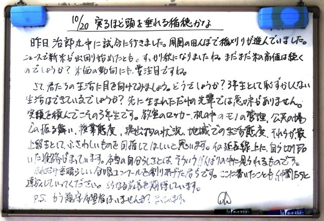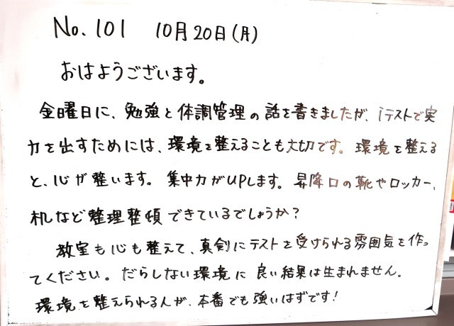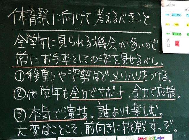 合唱コンクールや体育祭と大きな行事が続いていますが、その取り組みと同時に進路選択の準備や学習に集中して取り組んでいる姿は、とても素晴らしいです。一つ一つの取り組みが、みなさんの力になっていきます。先生たちも応援しています。今週も目標に向かってがんばって行きましょう。