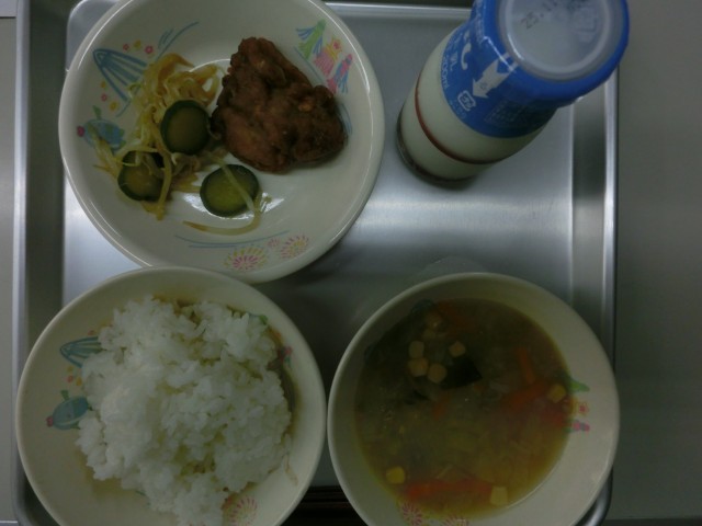ユーリンチーは、揚げたとり肉にしょうゆや酢、ねぎなどで作ったたれをかけた中国の料理です。中国では、骨付きで衣なしのものもありますが、今日の給食では、下味をつけたとり肉に衣を付けて揚げ、特製のたれをかけました。