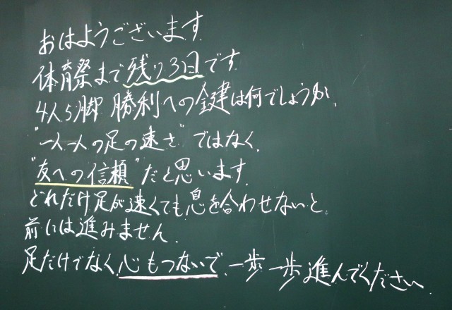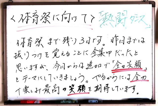 体育祭まであと3日。気持ちがどんどん高まってきている2年生の子ども達、今日はどんな姿で練習に取り組んでくれるでしょうか。はじけるような笑顔がいっぱいの姿を楽しみにしていますよ。