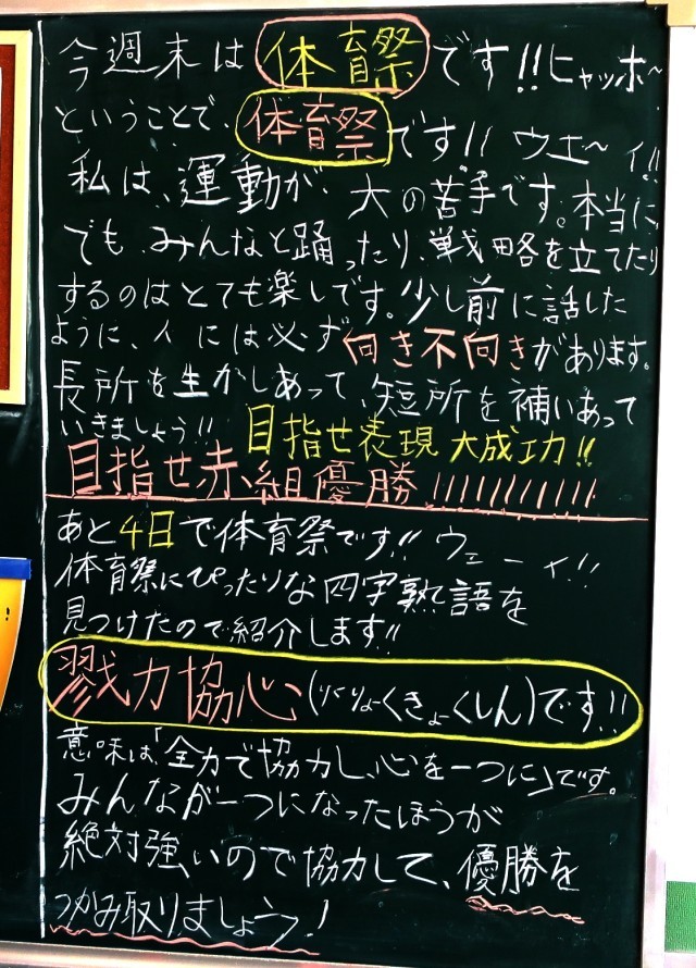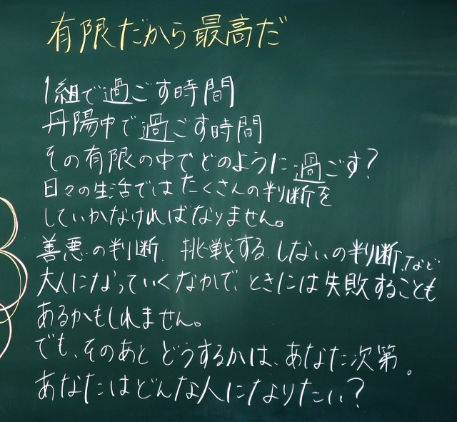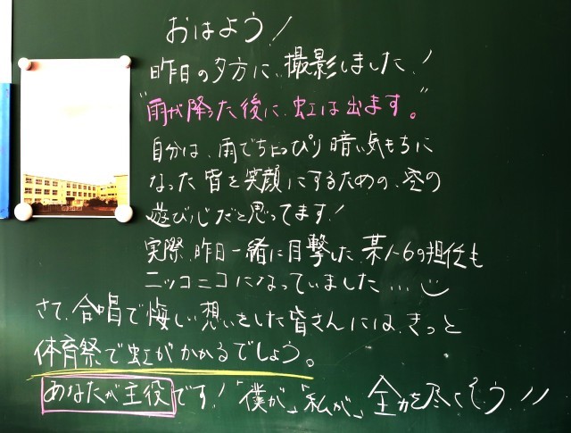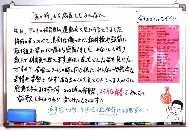 体育祭への取り組みを通して何を学ぶことができるでしょうか。体育祭を通して、大切な人たちに何を伝えることができるでしょうか。そんなことを考えながら、残りの練習に臨んでくれたらうれしいです。1年生のみなさんの「カッコイイ」姿が楽しみです。