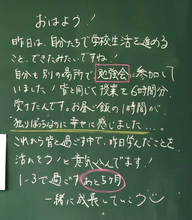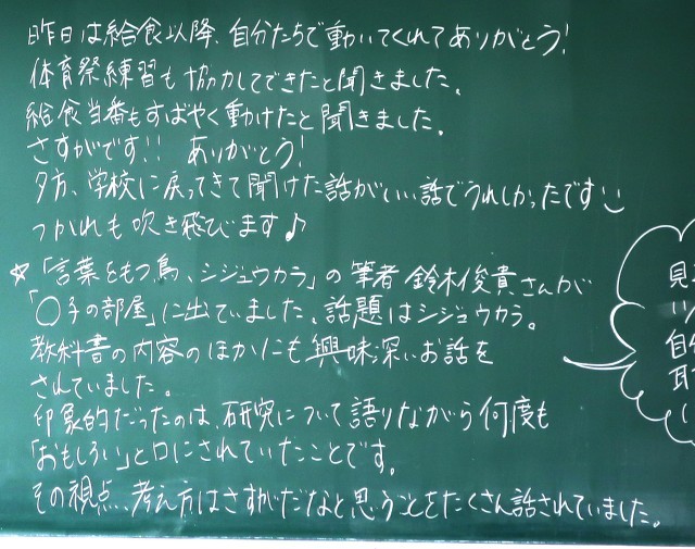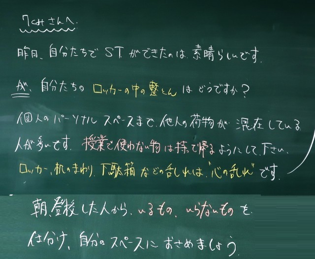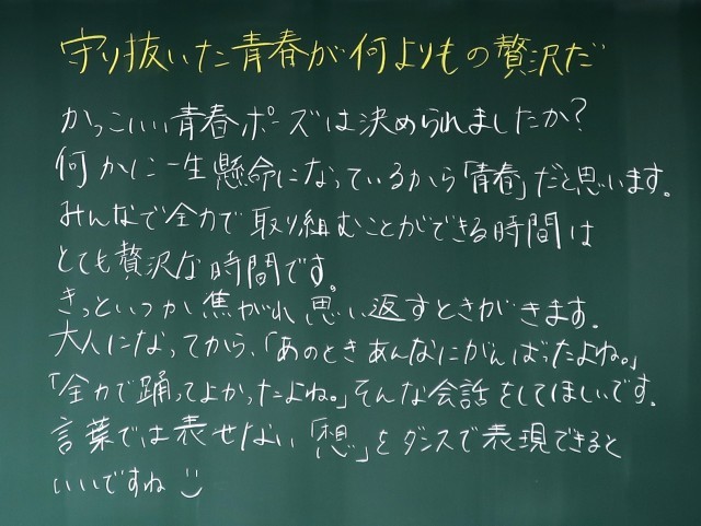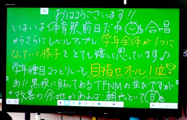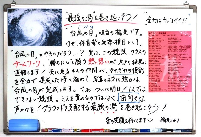 いよいよ明日が体育祭です。今日は予行練習があります。クラスの団結力、学年の団結力を高めるチャンスです。明日に備えて最後の調整をしていきましょう。