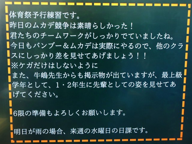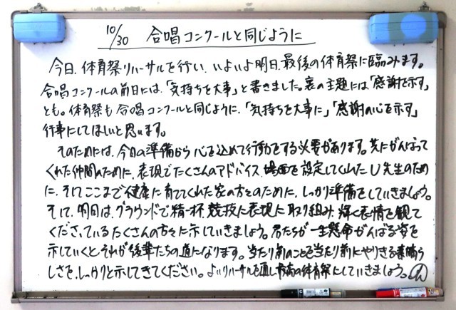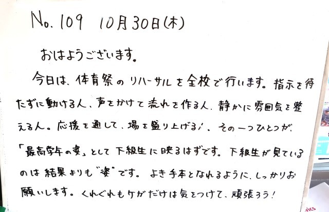 登校してくる3年生の生徒に「明日は(天気が悪いので)寒くなりそうだね」と声をかけたら「僕たちが熱くします!」と力強い返事をしてくれました。明日は体育祭です。3年生のみなさんにとって、義務教育で最後の体育祭になります。きっと素敵な思い出になりますね。みんなでがんばりましょう。