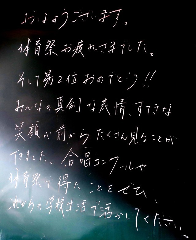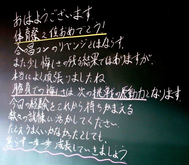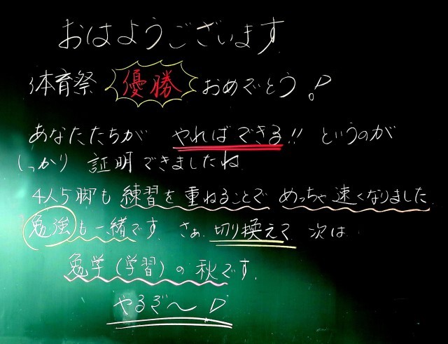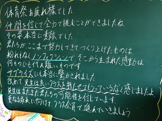 クラスの輪、学年の団結力が高まった体育祭でした。勝ち負けも気になりますが、一生懸命さは全員が1番でした。体育祭で作り上げたものを普段の生活にも生かしていきましょう。