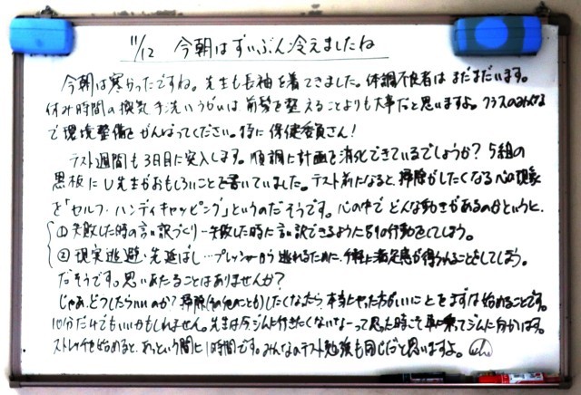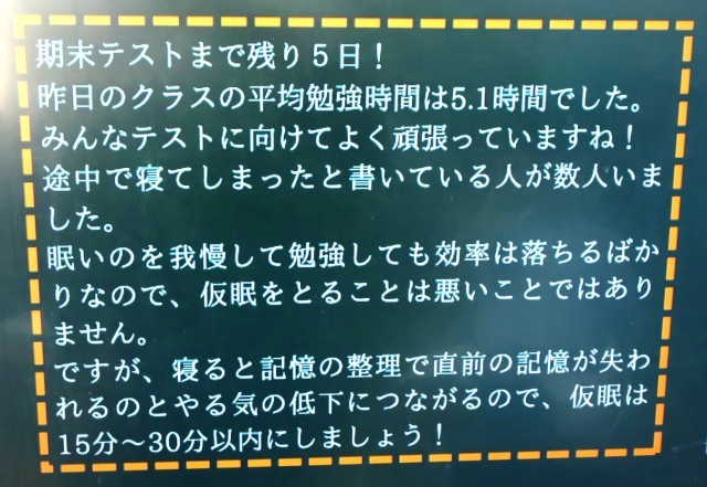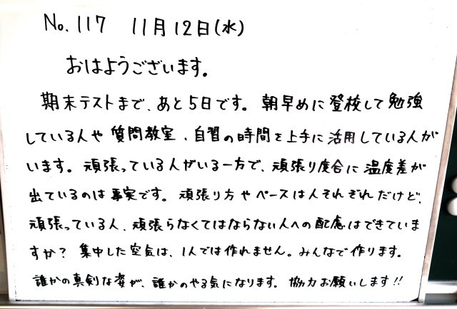テスト週間に入り、3日目になります。仲間と一緒に力を高めていきましょう。
