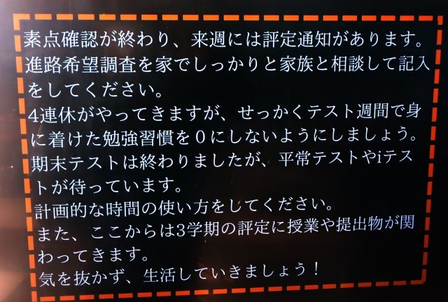 毎朝、メッセージボードや黒板の前に立ち、子ども達に気持ちを伝えたいと思う先生たちの姿があります。毎朝、その気持ちを受け取ろうとしている子ども達の姿があります。温かい気持ちが広がっていることを感じます。