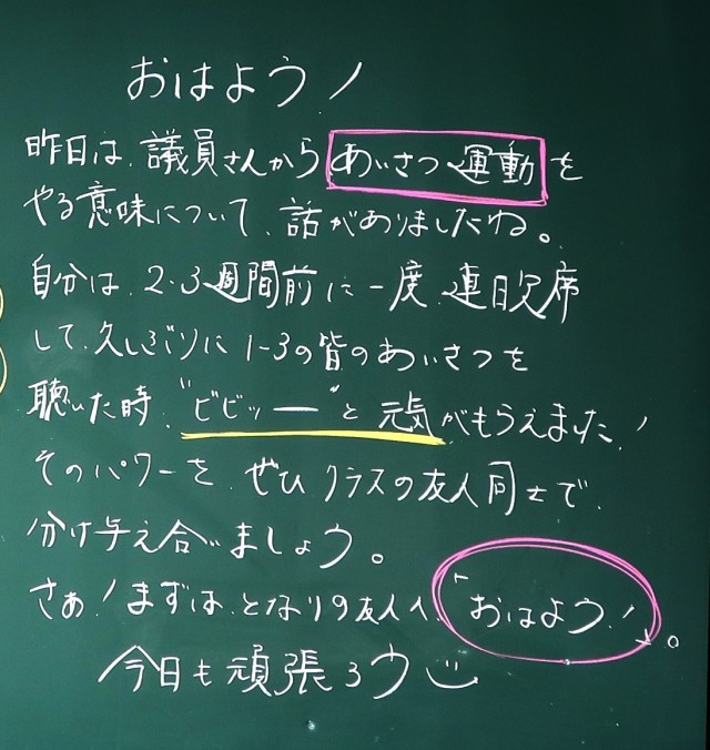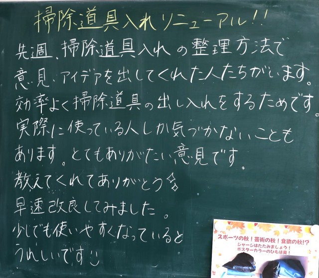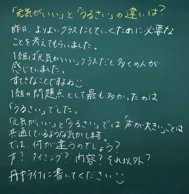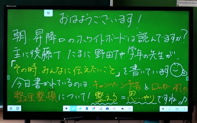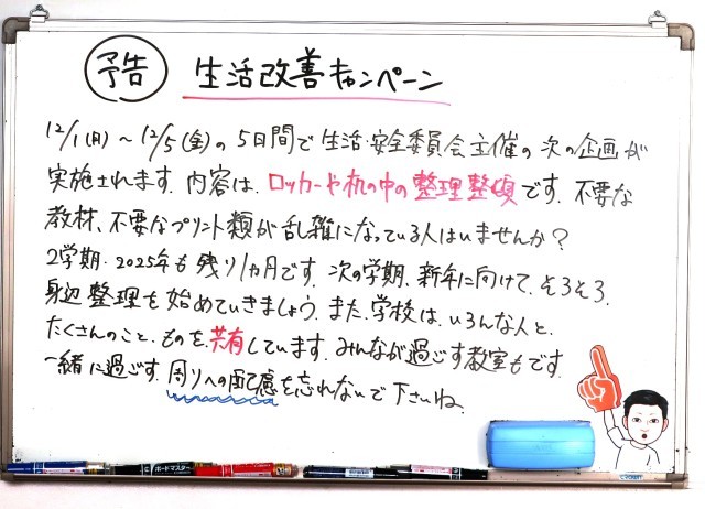 1年生では、新しいキャンペーンが始まるようですね。自分達の生活を見直すよい機会になると思います。友達と協力してしっかり取り組んでくださいね。
