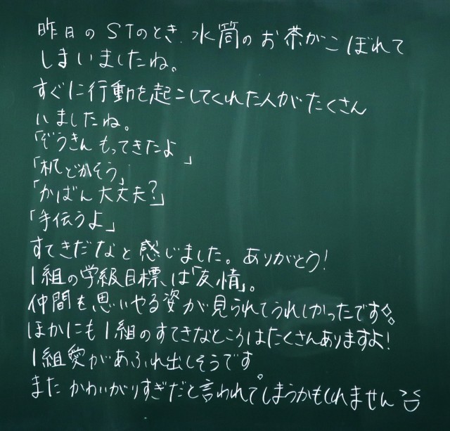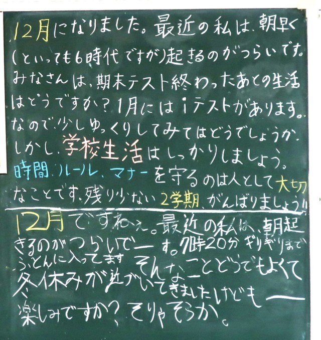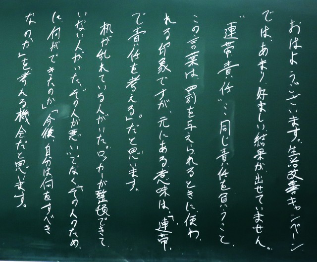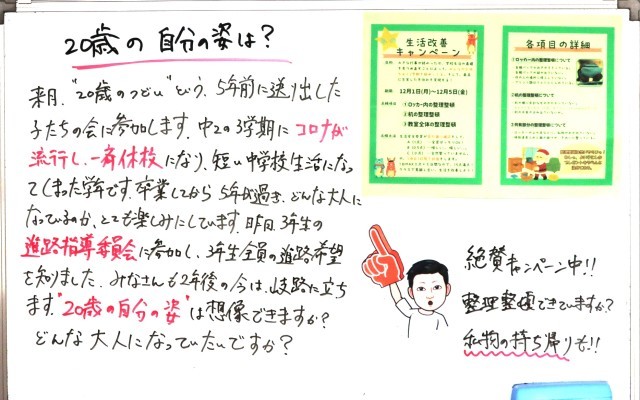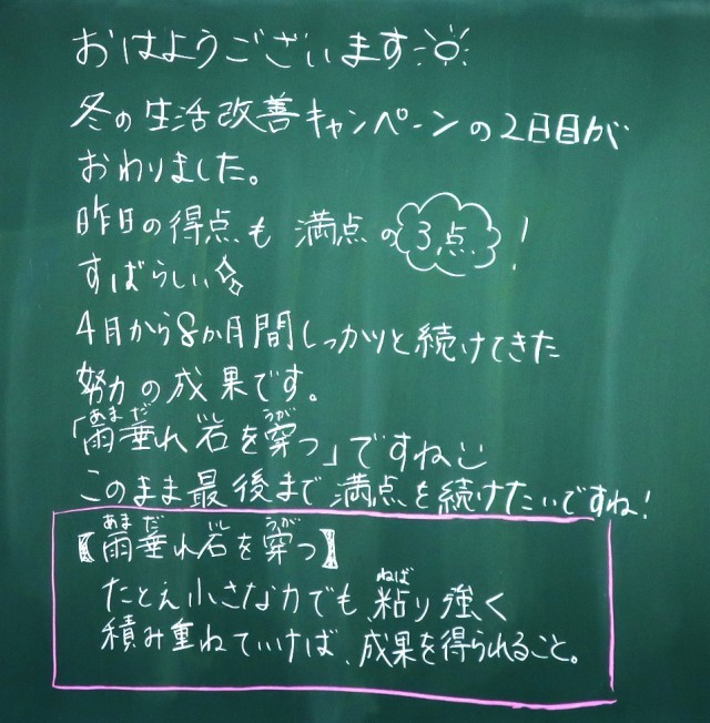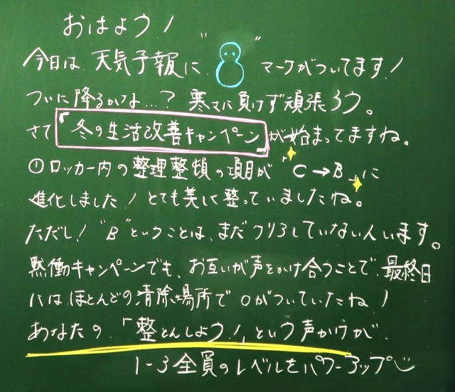1年生では、「冬の生活改善キャンペーン」を行っています。全員が身の回りの整理整頓を心がけ、過ごしやすい生活環境を作るためにがんばっています。気が付いたら、声を掛け合う姿が、とても立派です。