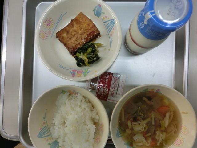 今日は「正しいはしづかいの日」です。はしにはたくさんの使い方があります。絹厚揚げを「切る」、こまつなのおひたしを「はさむ」、みぞれ汁の具を「すくう」、それらを口に「運ぶ」など、正しいはしづかいを意識して食べましょう。