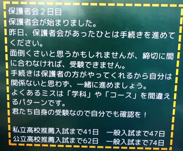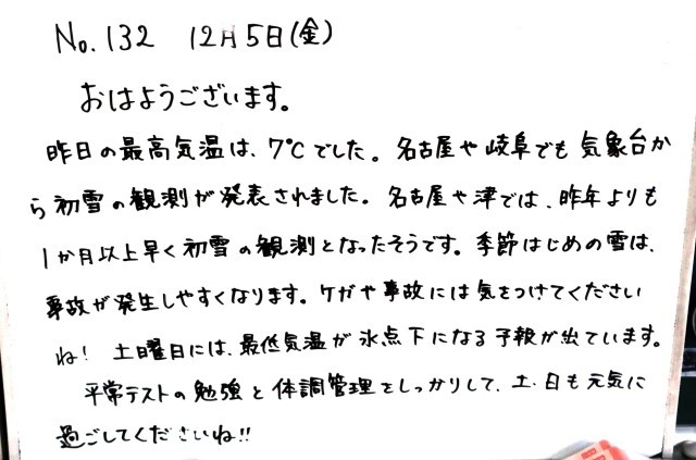 今日は、保護者会の2日目になります。昨日の保護者会で、進路選択についてしっかりとお話をすることができた人は、目標に向かってしっかり準備をしていきましょう。寒さが厳しくなってきています。体調管理をしっかりしてくださいね。