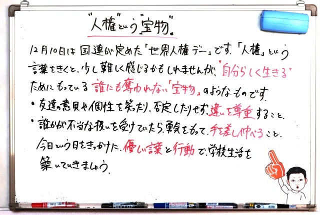 今日は、世界人権デーです。この機会に、ぜひ自分自身の生活を振り返ってみましょう。何気ない一言、何気ない行動にも責任をもつことができる人でありたいですね。