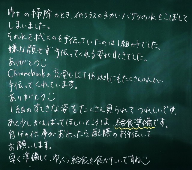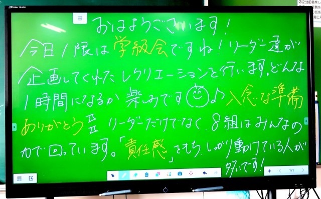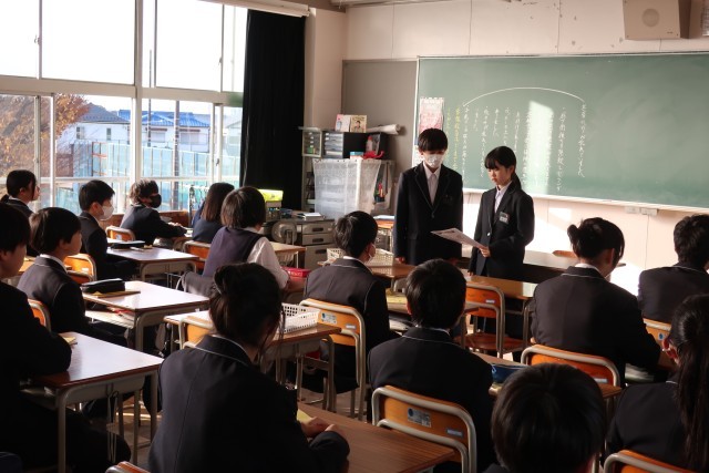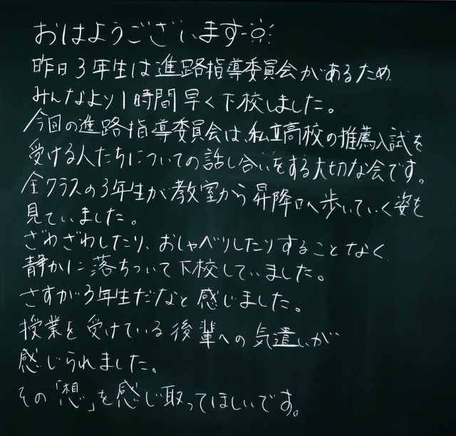 今朝も、落ち着いた雰囲気で1日がスタートしました。登校後、学習用具を整理したり、係の仕事に取り組んだりするなど、その日の予定を考えながら、自分で行動することができています。さすが中学生。成長が感じられます。