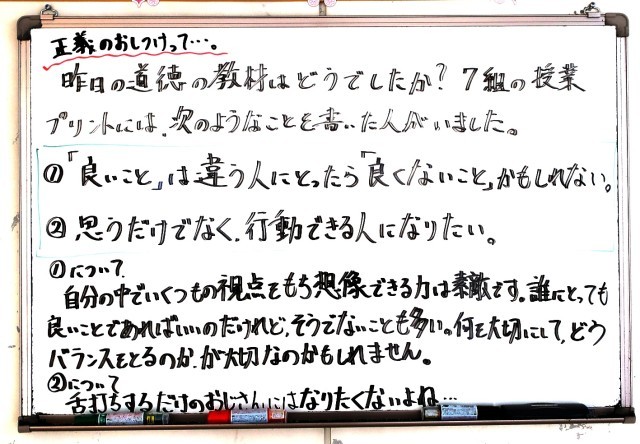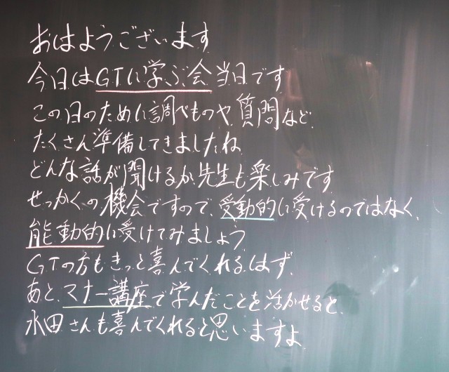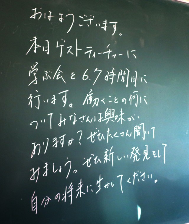 今日の午後、ゲストティーチャーに学ぶ会を行います。今日まで、みんなで協力して準備を進めてきました。参加したすべての人にとって、実り多い学びの時間になると思います。講師の先生への感謝の気持ちをしっかりともち、会に参加していきましょう。