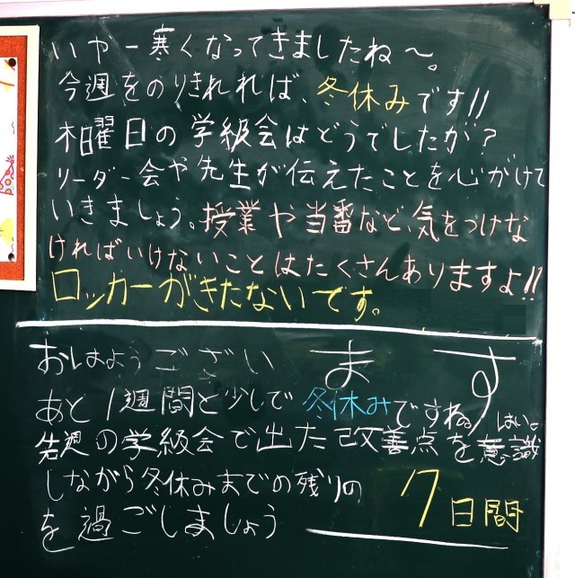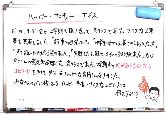 リーダー会の子ども達が中心となり、各クラスで学級会が行われています。その中で出てきたクラスの課題について、みんなで協力して解決しようとがんばっています。そのおかげでクラスの雰囲気が、さらに良くなってきたことを感じます。クラスの課題を自分事として考えて行動する力が育ってきています。成長が楽しみです。