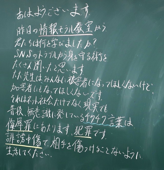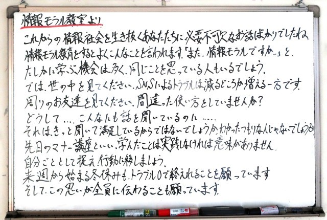 昨日の情報モラル教室は、軽はずみな行動が、その後、大きな問題に発展することを改めて認識する機会になりました。便利な道具であっても、それを扱う人の心が大切です。これからも、相手を思いやる気持ちを大切にして生活していきましょう。