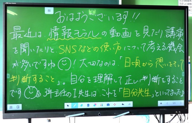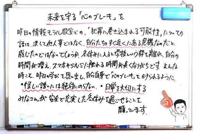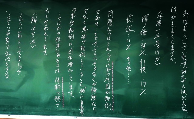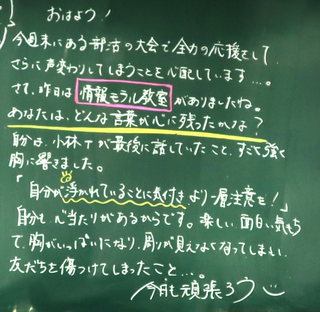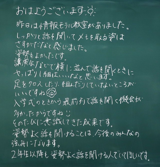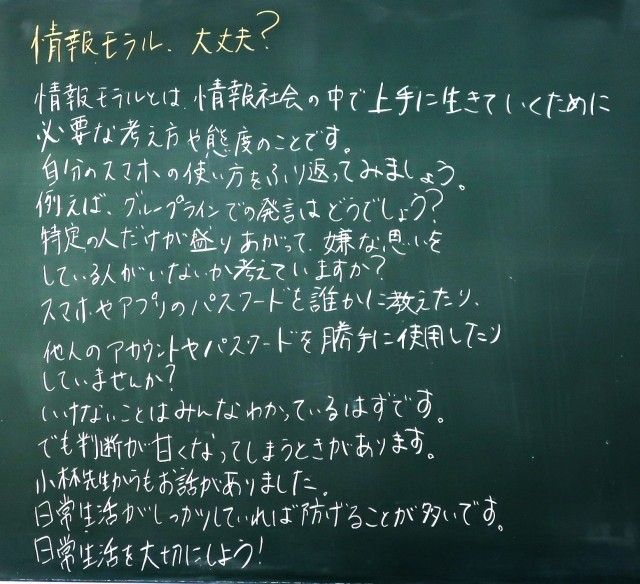 昨日の情報モラル教室では、講師の先生のお話をしっかり聞き、今後の生活に役立てていこうとする気持ちが、その姿に表れていました。今日は、午後から学校保健委員会があり、ケガが少ない体の使い方についてのお話を聞きます。多くのことを吸収して、充実した生活につなげていきましょう。