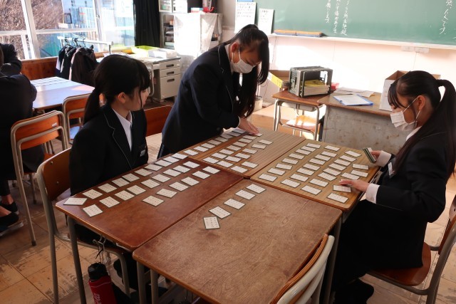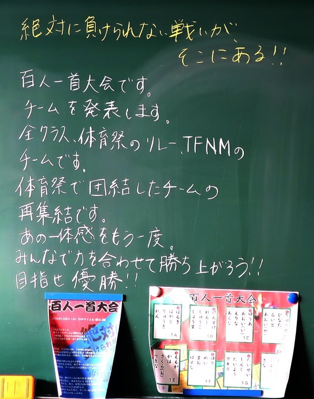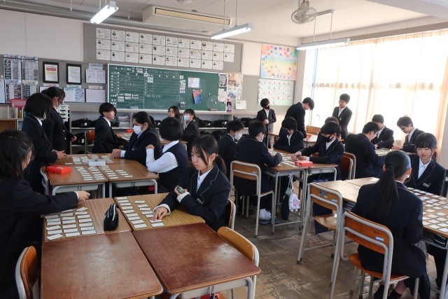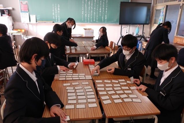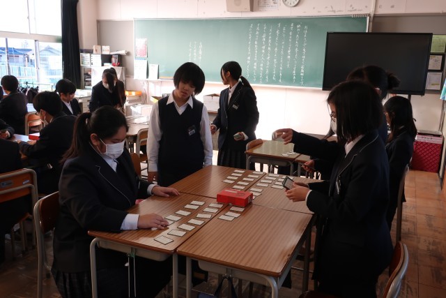1年生は,、1月8日に「百人一首大会」を行います。各クラスで作戦を練りながら、練習を行っています。冬休み中の時間も上手に使ってチーム力を高めてくださいね。みなさんの活躍する姿を楽しみにしています。