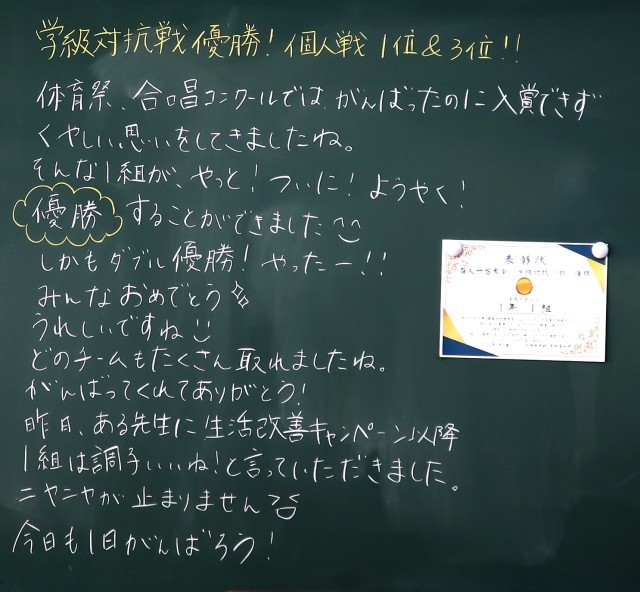 昨日の百人一首大会は、大変盛り上がりましたね。みんなで協力してがんばることで、どんどんクラスの団結力が高まっていきますね。素晴らしいです。この力を生活のいろいろな場面で発揮することができるようにできるといいですね。みなさんの成長が楽しみです。