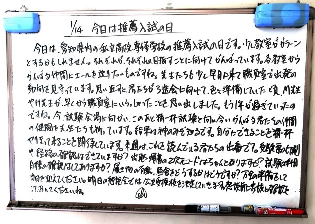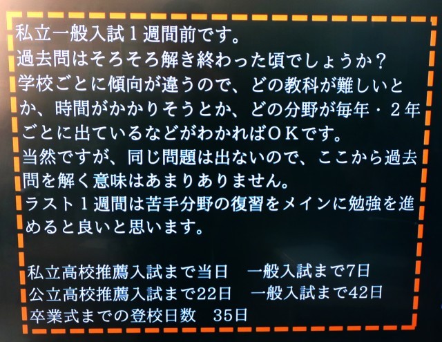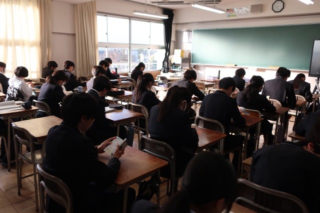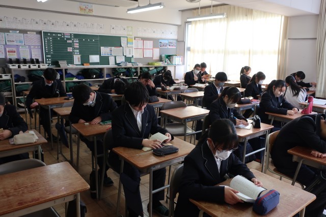 私立高校等の推薦入試のため、いつもより空席が目立つ教室です。一週間後には、私立高校等の一般入試が行われます。教室にいる子ども達からは「次は自分ががんばる番だ」という思いを感じます。一人一人の夢の実現を応援します。がんばれ、丹中生!