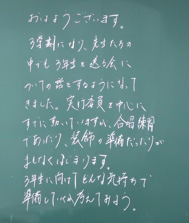 2年生のみなさんは、3年生を送る会の準備が少しずつ始まりますね。今まで、後輩たちの手本となってがんばってくれた先輩たちに感謝の気持ちを伝えるために、いろいろと工夫をしてくれていると聞きました。2年生のみなさんの活躍を楽しみにしています。よろしくお願いします。