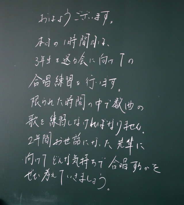 2年生の子ども達が、3年生を送る会に向けての準備を進めてくれています。一人一人の思いが先輩たちに伝わるよう、がんばってくれています。ありがとうございます。2年生のみなさんのチームワークで作り上げる送る会を楽しみにしています。