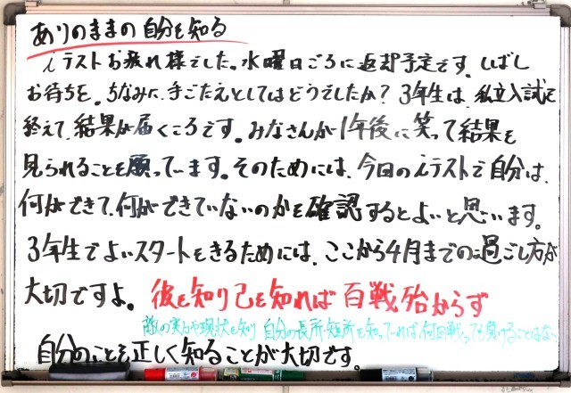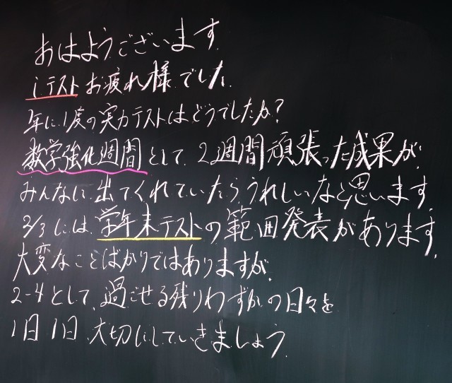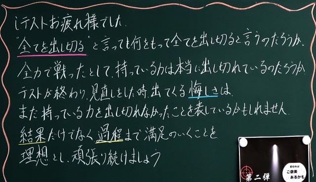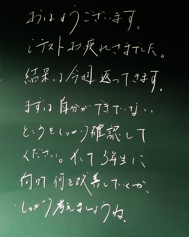 先週末のiテストは、しっかりがんばることができましたか。返却されるテストをもとに、これからどんなことを努力するといいか考えたり、担当の先生に相談したりするといいと思います。一歩ずつ、でも確実に前進していきましょう。