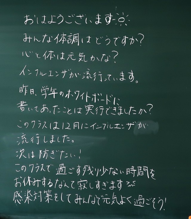 今日も穏やかな雰囲気で1日が始まりました。体調を崩している子も出てきています。うがい、手洗い、換気をしっかりして、健康な生活を心がけていきましょう。