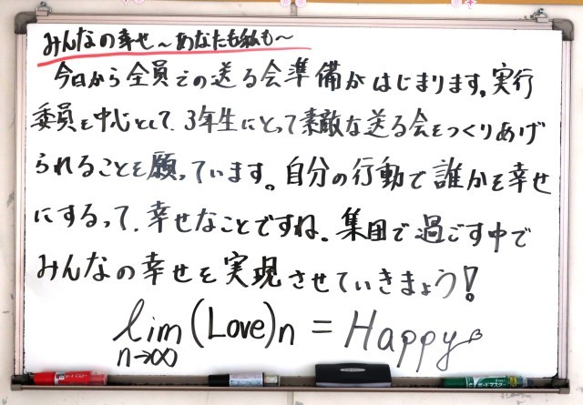 2年生の皆さんは、3年生を送る会に向けて準備を本格的にスタートしています。一人一人が自分の役割を考え、主体的に行動してくれています。その思いが先輩たちに伝わるといいですね。楽しみにしています。