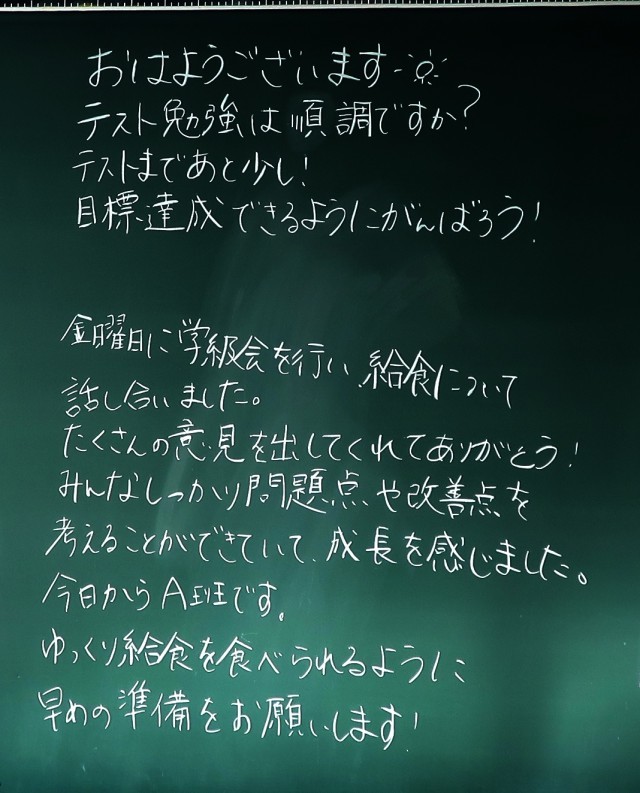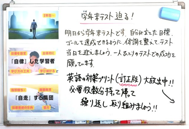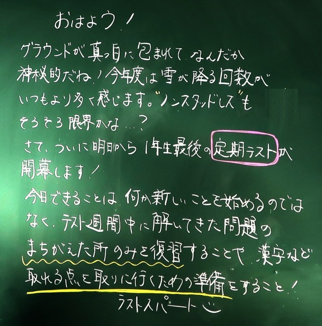 さあ、いよいよ明日から学年末テストが始まります。この週末に、しっかり準備はできたでしょうか。1年間の総まとめになります。努力の成果を十分に発揮してくださいね。