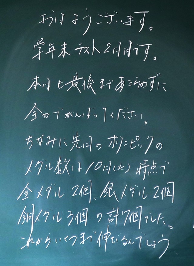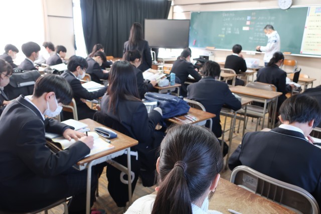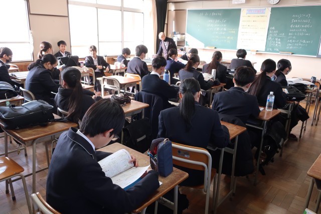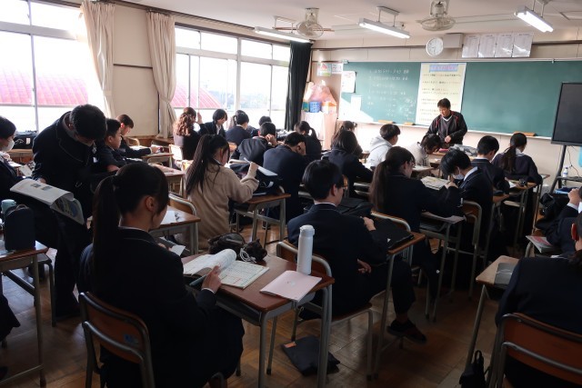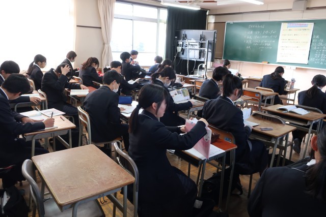 テスト直前の教室の様子です。友達と学習内容を確認したり、自分でまとめたノートを読み返したりしています。真剣にテストに向かう姿勢が素晴らしいです。最後までがんばり切りましょう。