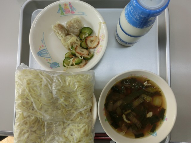 ラーメンはよくかまずに飲み込んで食べてしまいがちです。よくかまずに食べると消化が悪くなり、胃や腸に負担がかかります。今日のしょうゆラーメンの汁には、たくさんの具材が入っていますので、これらの具材とともに、ラーメンもよくかんで食べるようにしましょう。