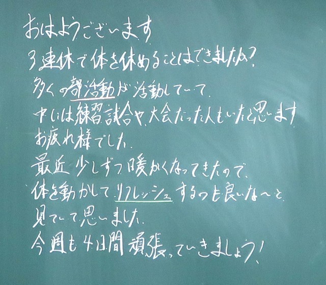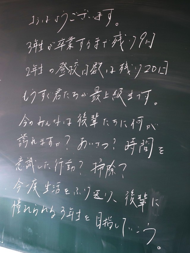 先輩たちをしっかり応援しよう、感謝の気持ちを伝えようという気持ちで、一生懸命に活動してくれている2年生のみなさん、ありがとうございます。みなさんの気持ちが、学校全体を温かい雰囲気にしてくれています。先輩たちが安心して生活できるよう、引き続きがんばってくれるとうれしいです。よろしくお願いします。