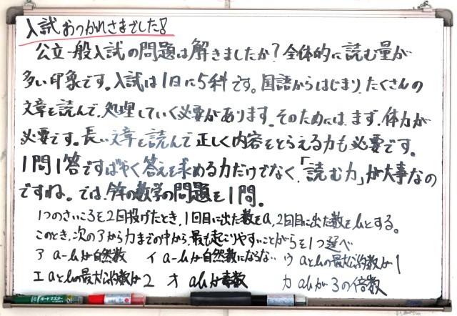 昨日は、愛知県の公立高校の一般入試がありました。今朝の新聞などで、入試に出題された問題が掲載されていたため、多くの2年生の子ども達が、興味深く目を通していました。半分以上は2年生でも解くことができる問題のはずですが、かなり手ごわい内容になっているようです。さあ、あと1年です。少しずつ準備をしていきましょう。