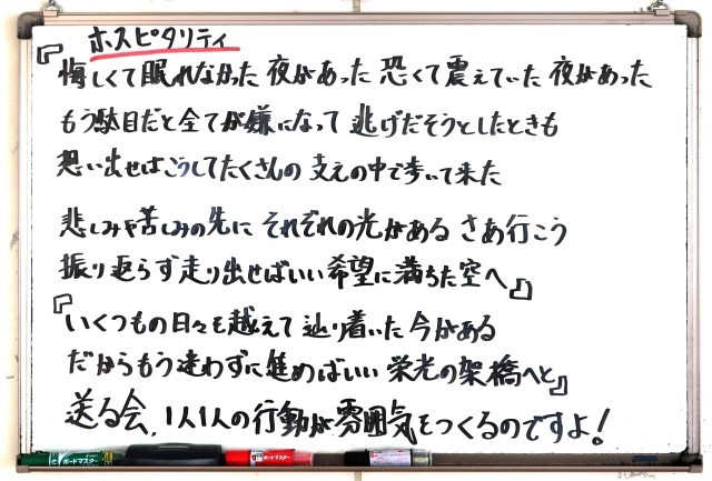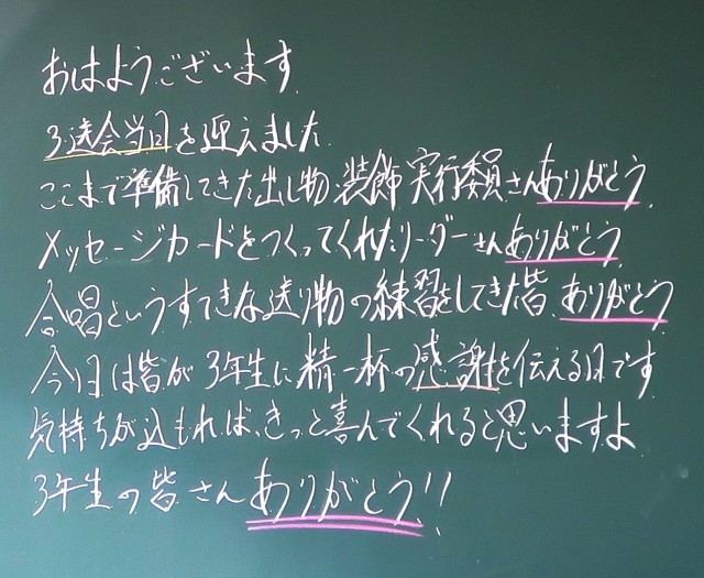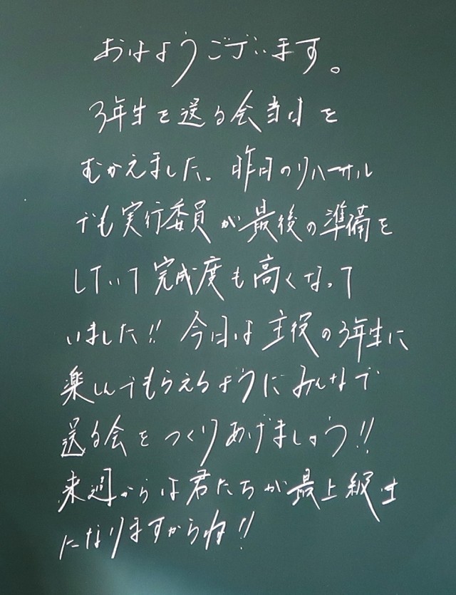 2年生のみなさんのがんばりのおかげで、学校全体が温かい雰囲気に包まれていることを感じます。送る会にむけてのリハーサルや準備に真剣に取り組む姿はとても素敵でした。今日の午後もよろしくお願いしますね。