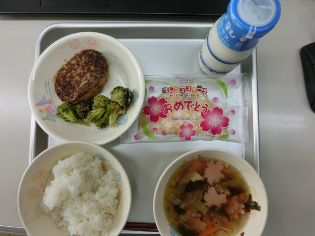 明日は中学校の卒業式のため、今日は中学校3年生の卒業を祝う献立です。桜のすまし汁には、めずらしい桜の形のかまぼこが入っています。かまぼこは魚から作られる練り製品で、日本各地で形や味などに工夫をこらしたさまざまなかまぼこが作られています。普段の食事からお祝いの特別な料理まで幅広く使われます。