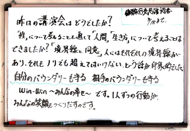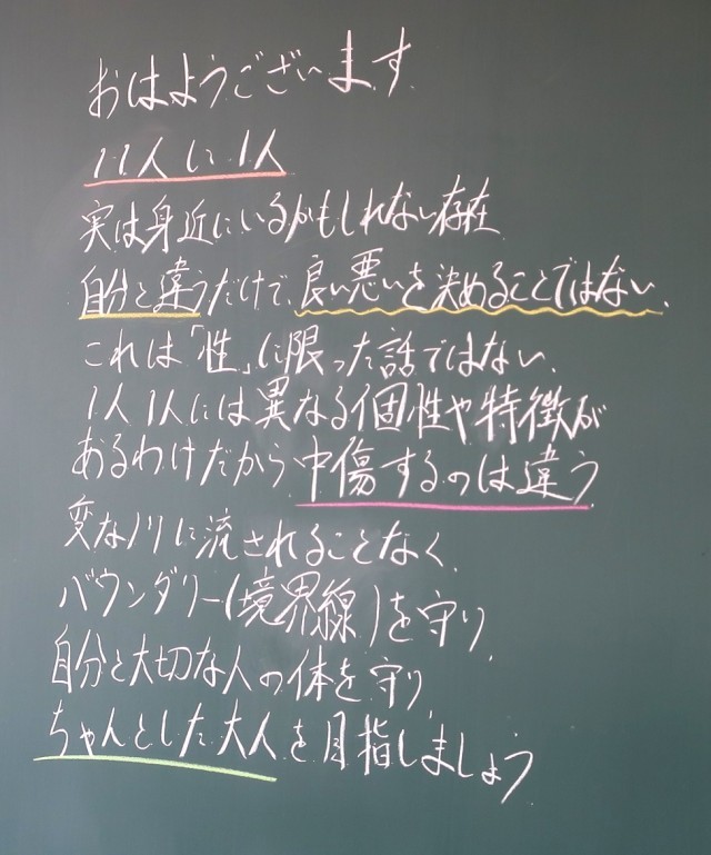 2年生の子ども達は、昨日、性教育の講演会に参加しました。自分自身が被害に合わないよう、また、知らぬうちに加害者にならないようにするために正しい知識を身に着けること、相手を思いやる気持ちを大切にすることなど、たくさんのことを学びました。今日からの生活に役立つことがたくさんありましたね。みんなで実践していきましょう。