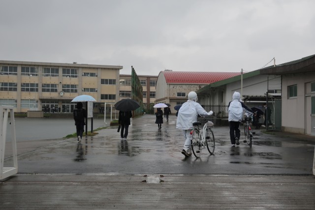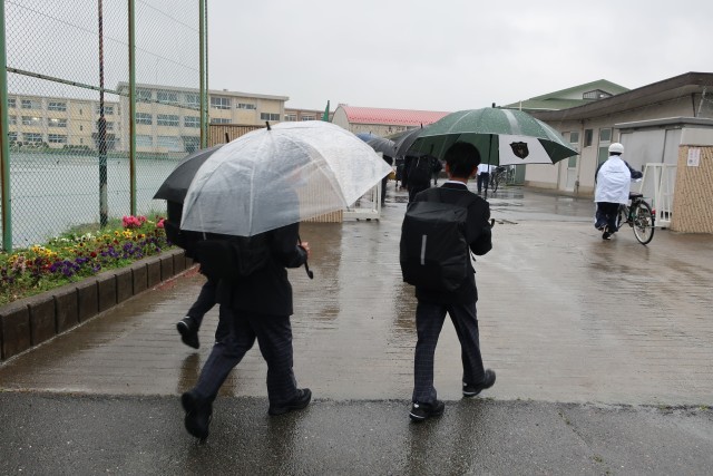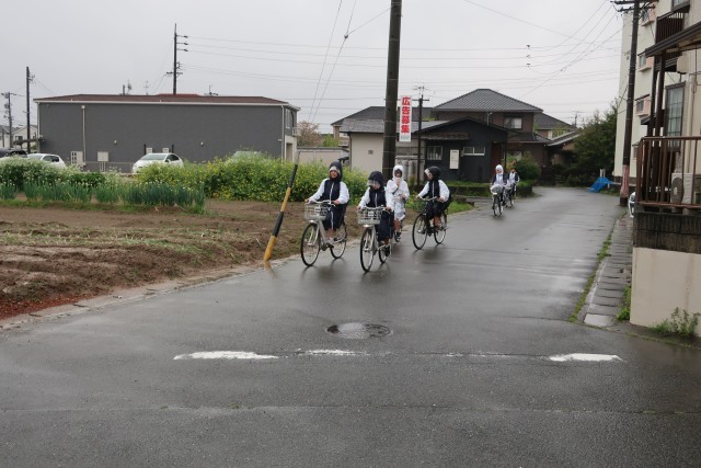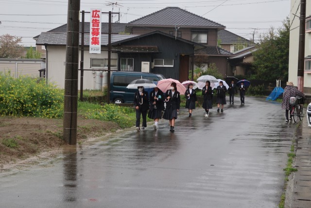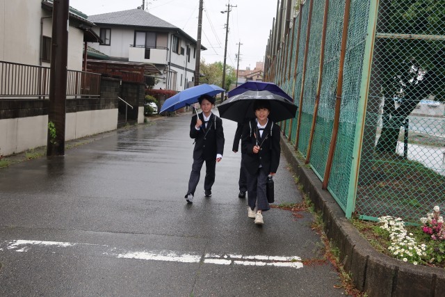 3学年そろっての登校は、今日が初めてでした。時間帯によってはかなり雨が強く降っていましたし、1年生のみなさんは慣れない道のりであったため、気を遣ったことと思います。大きなトラブルもなく、無事に登校できてよかったです。今後も、交通安全に気をつけて登下校していきましょう。