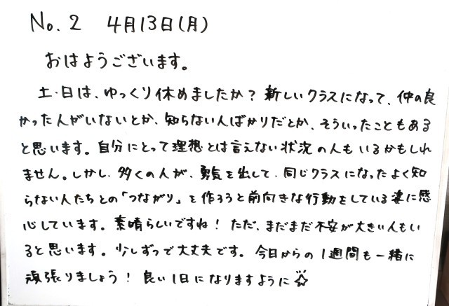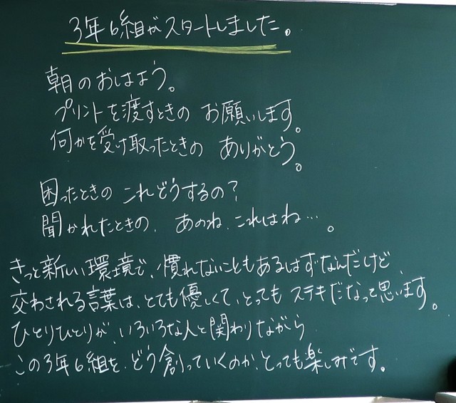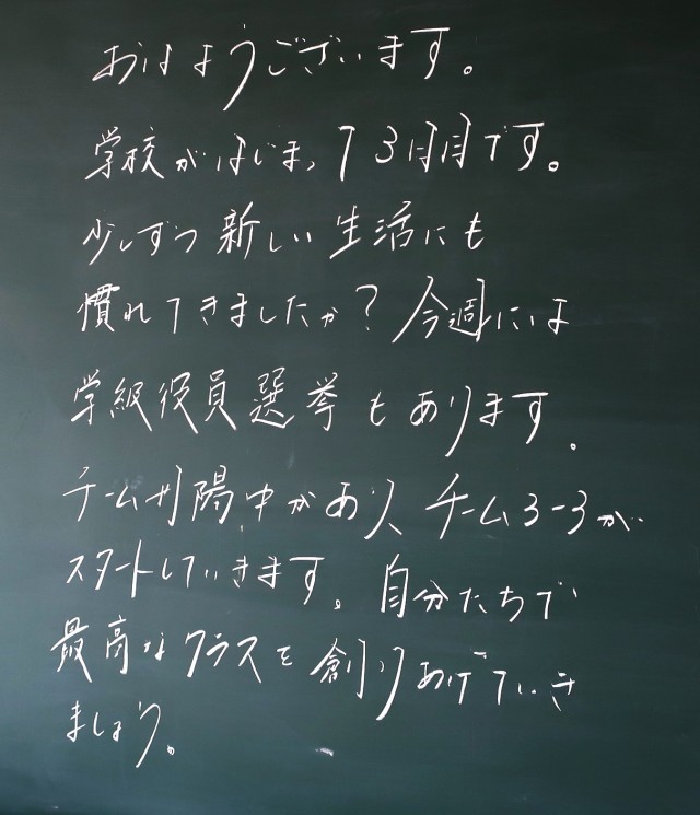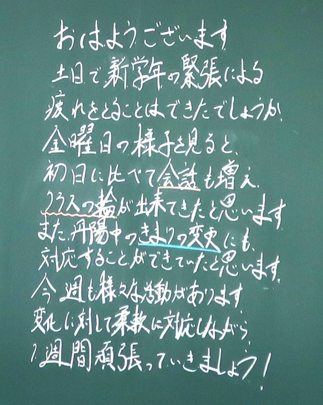先週は、新しい環境になり緊張の2日間であったと思います。週末にゆっくり休むことができたでしょうか。今日も新しい仲間とともに学級作り、学年づくりを行います。互いを思いやる気持ちを大切にして充実した1日にしていきましょう。