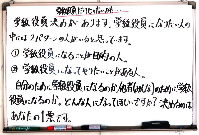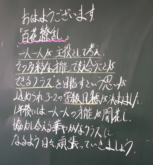 今日の午後、今年度になって初めての清掃活動を行います。昨年度に引き続き、集中して取り組む姿を後輩たちに見せてやってくださいね。また、学級組織づくりも予定されています。よりよいクラスづくりのために、みんなで協力していきましょう。